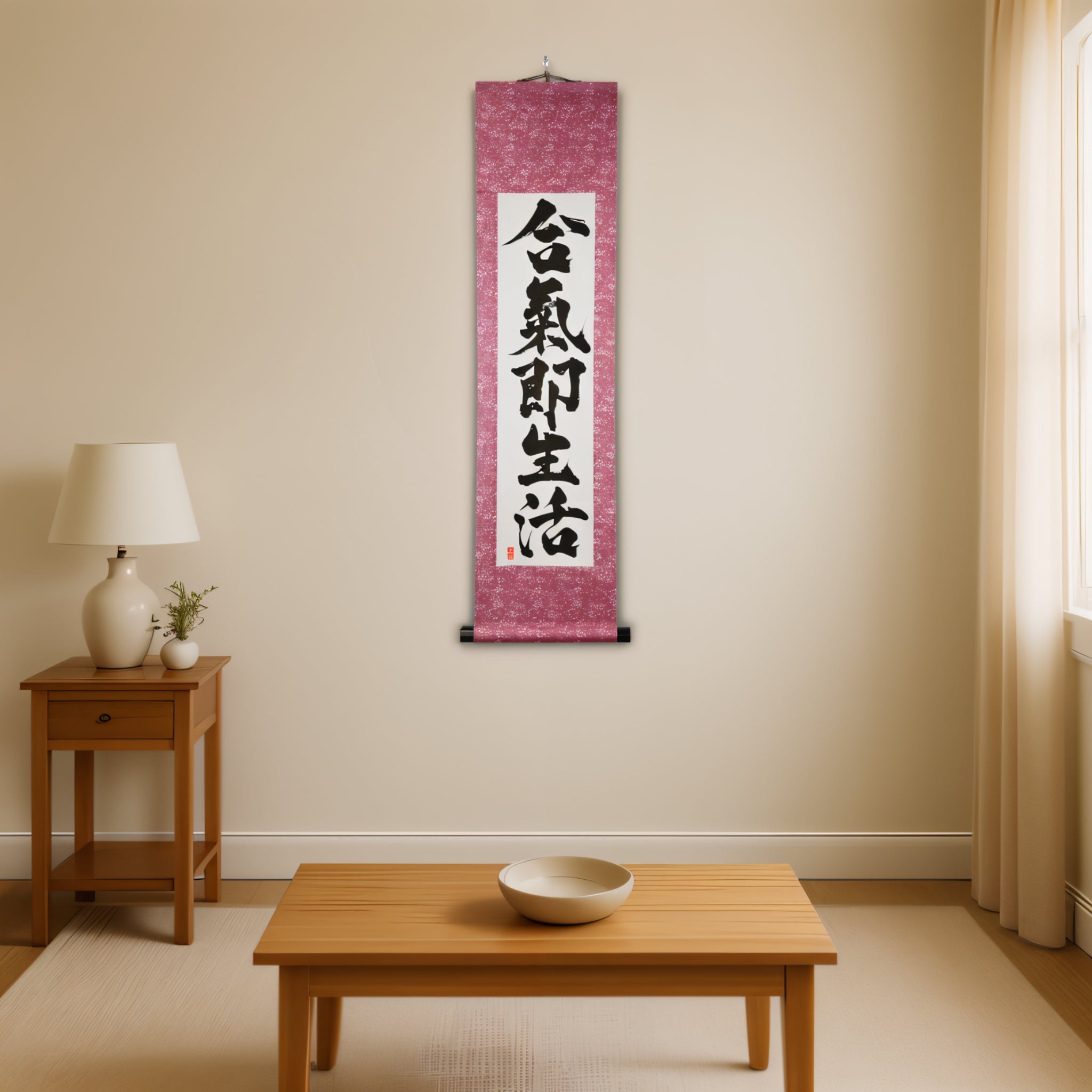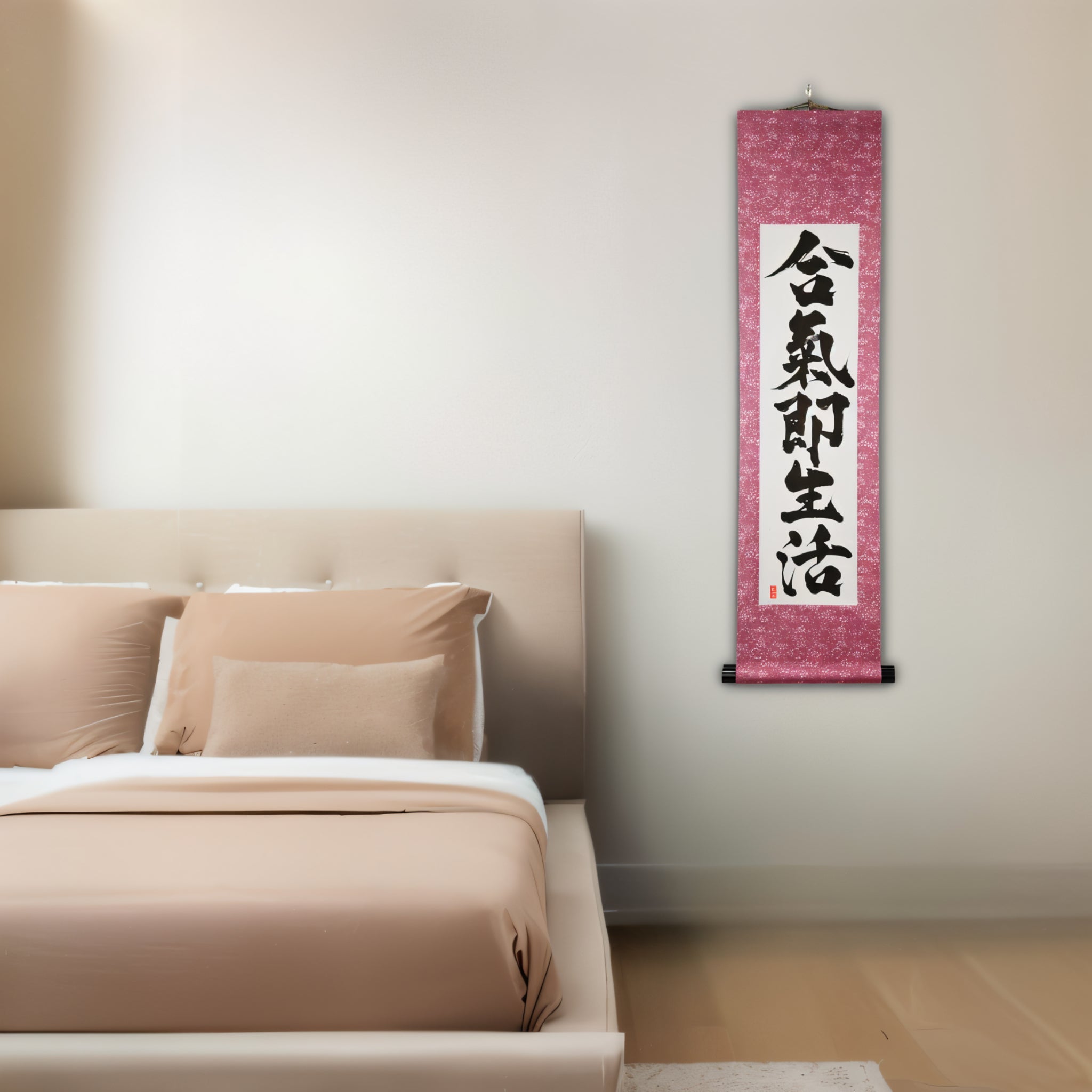 This Japanese calligraphy scroll features the profound phrase 合気即生活 (Aiki Soku Seikatsu) — "Aikido is daily life". It expresses a core principle of Aikido: the art is not confined to the dojo, but flows through every moment of our lives.