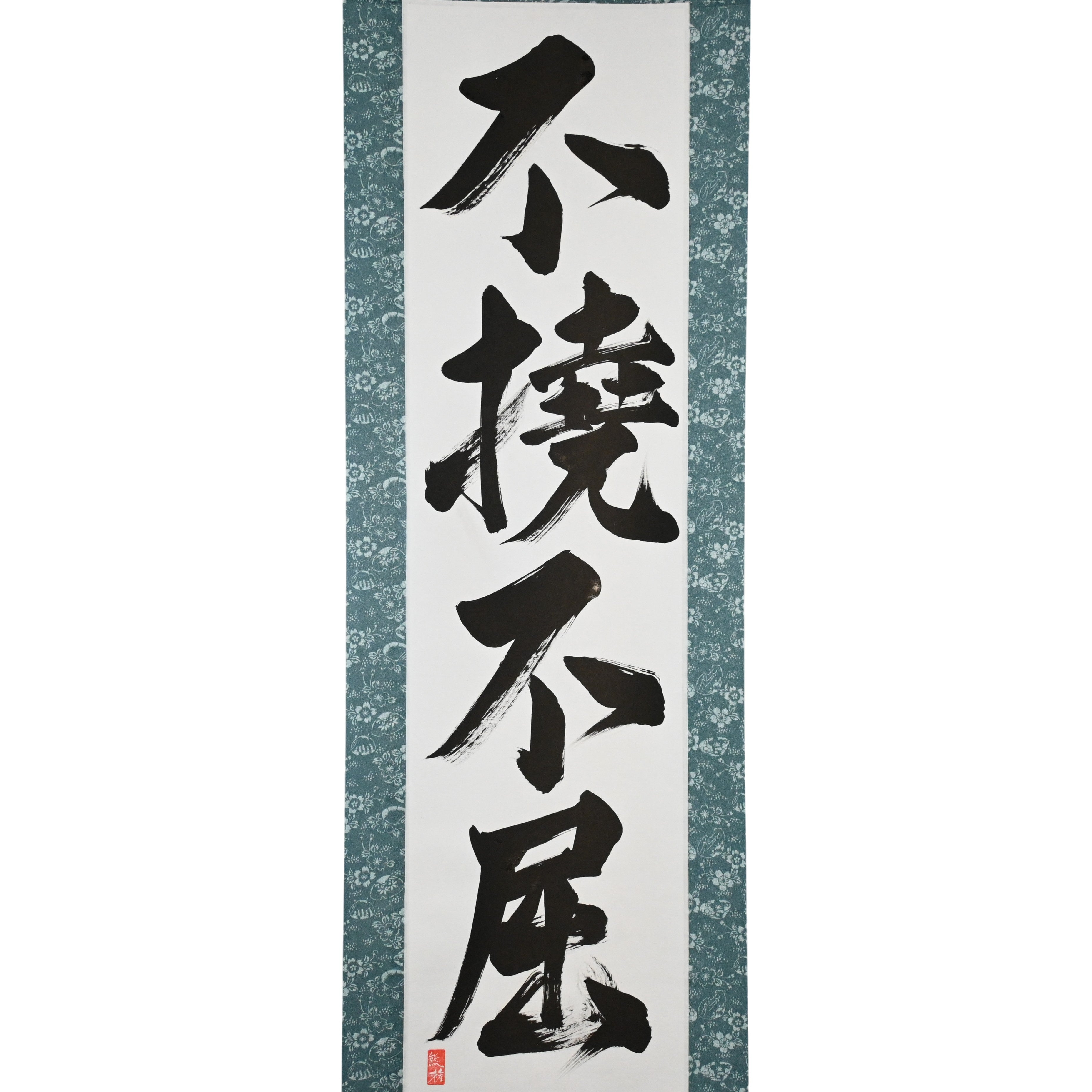 This Japanese calligraphy scroll features the bold phrase 不撓不屈 (Futō Fukutsu) — a powerful expression of the indomitable spirit that lies at the heart of Japanese martial arts and the Samurai code.