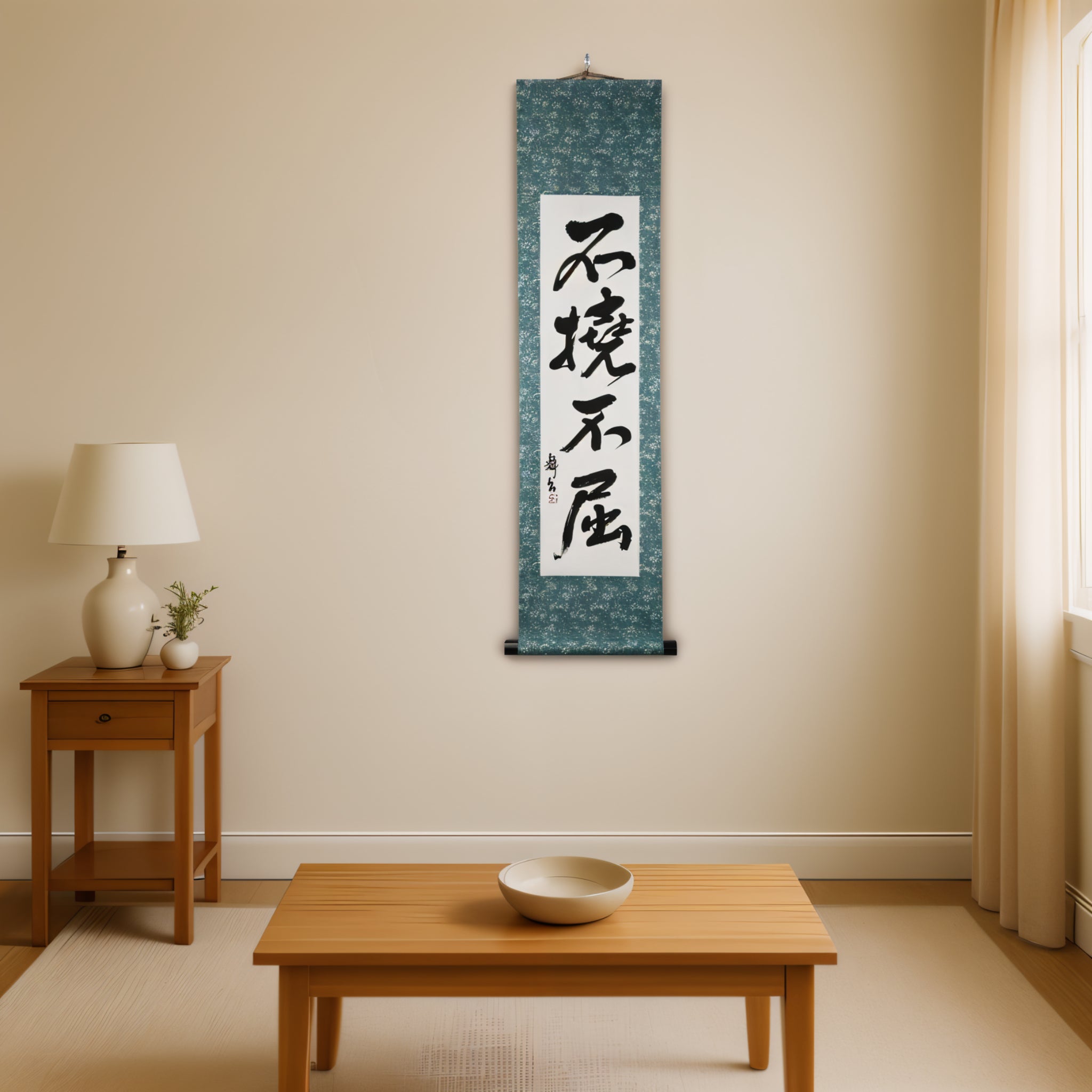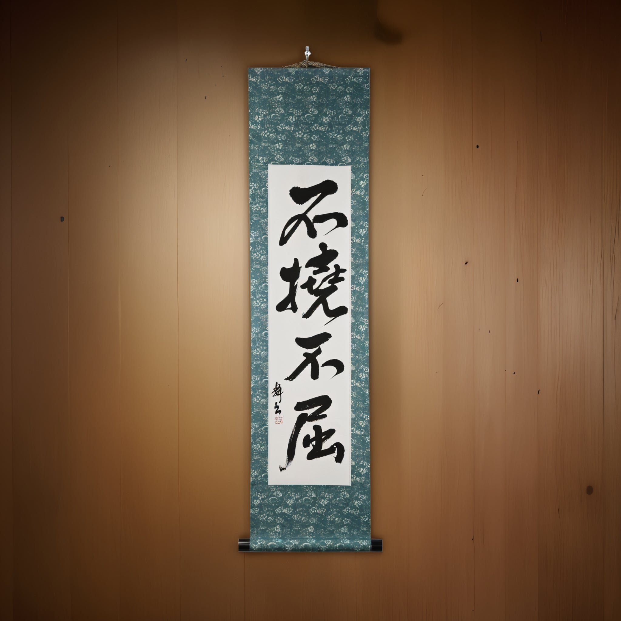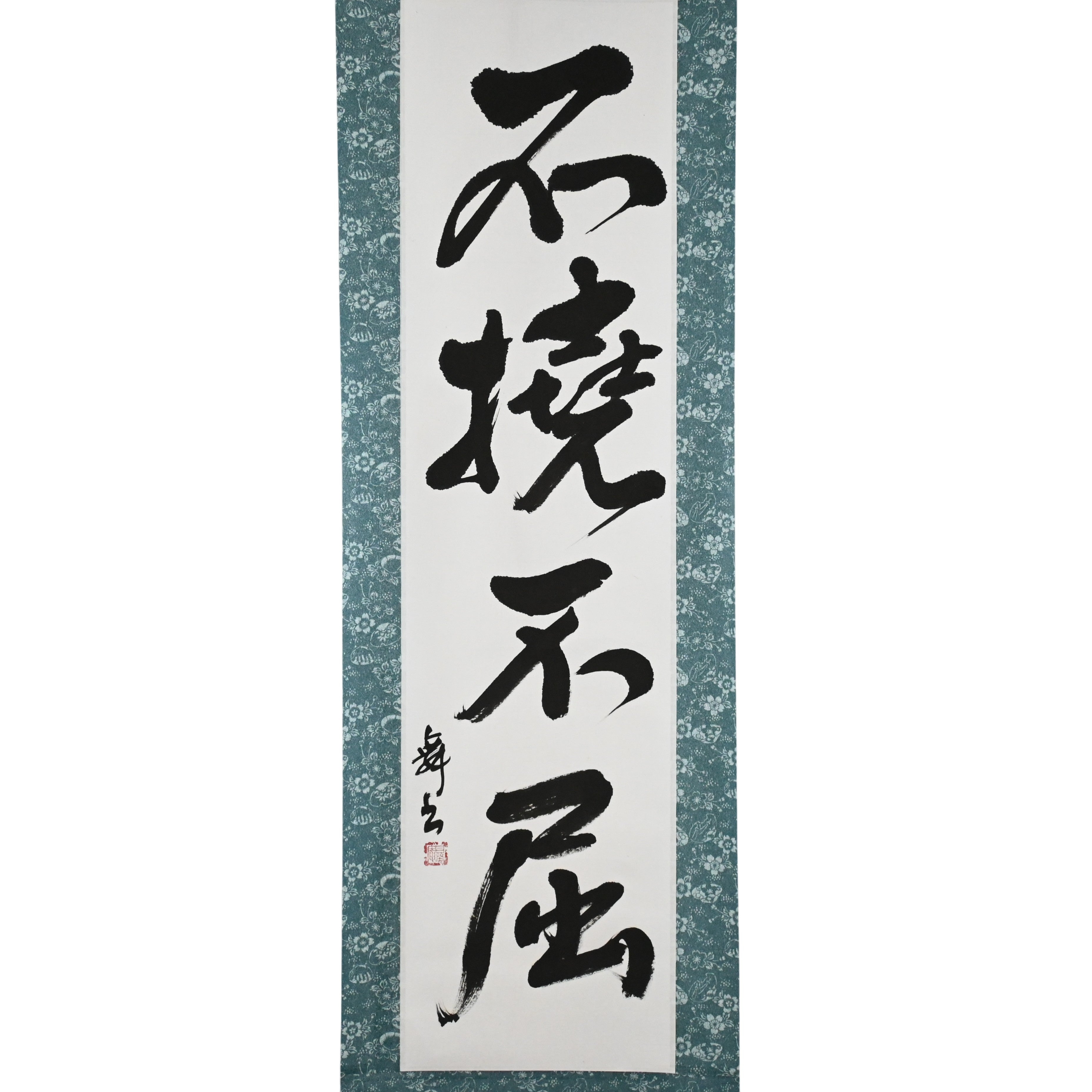 This Japanese calligraphy scroll features the bold phrase 不撓不屈 (Futō Fukutsu) — a powerful expression of the indomitable spirit that lies at the heart of Japanese martial arts and the Samurai code.