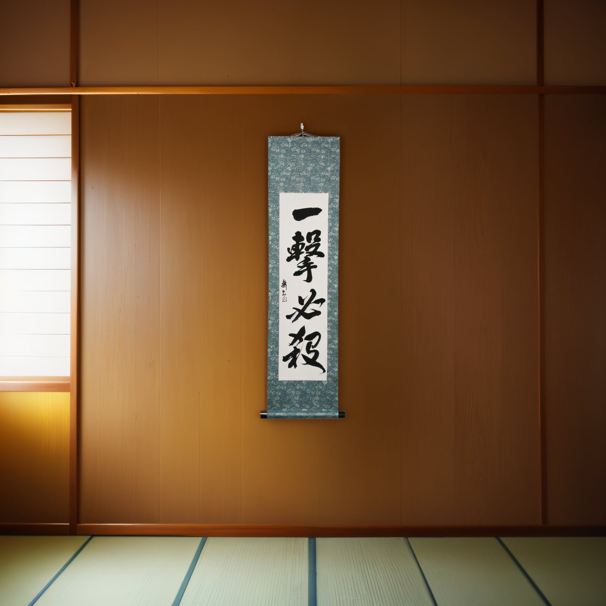 Embodying the core philosophy of Karate, this striking Japanese calligraphy scroll features the phrase 一撃必殺 (Ichigeki Hissatsu) — meaning “One Strike, Certain Kill”. It reflects the ideal of delivering a single, precise, and decisive technique that ends the conflict in an instant.