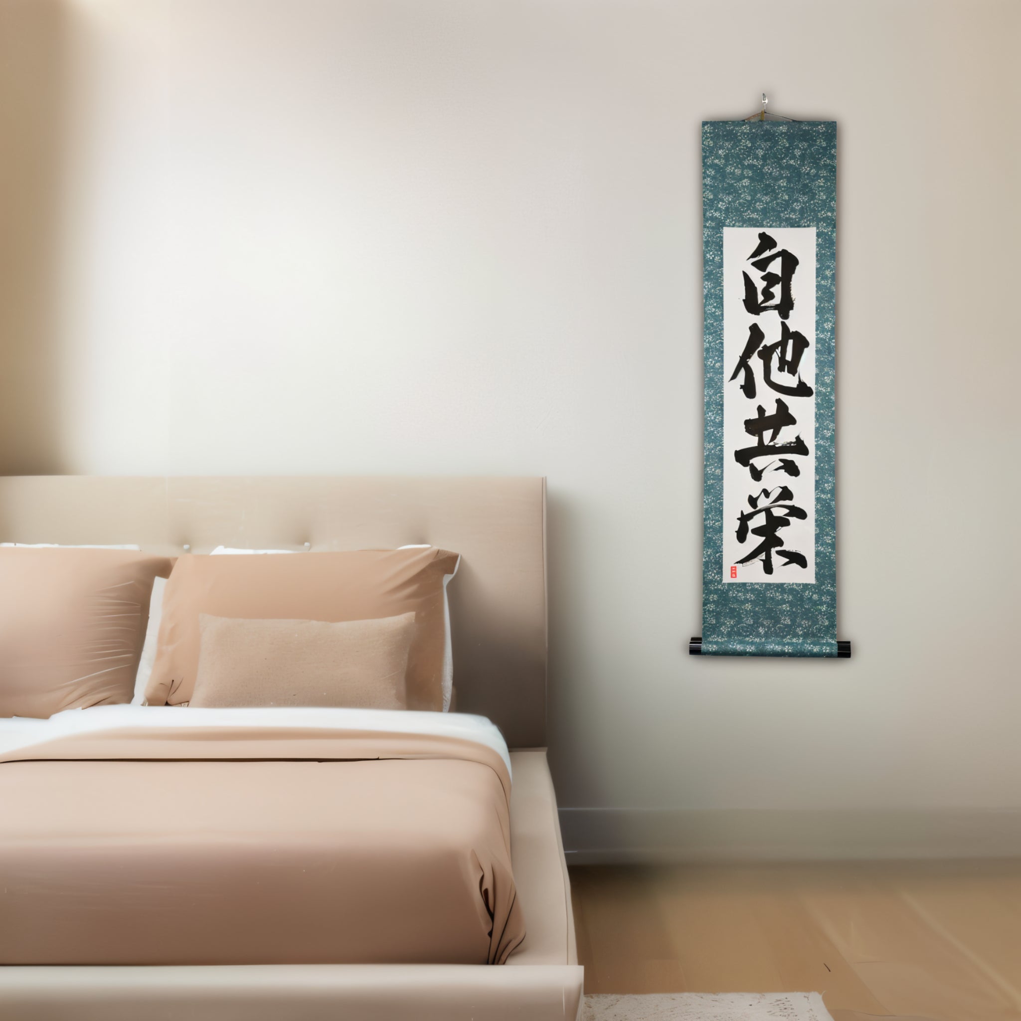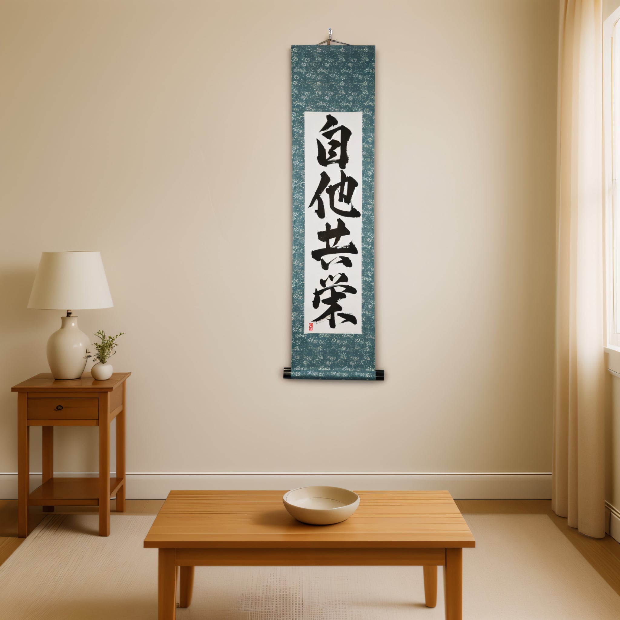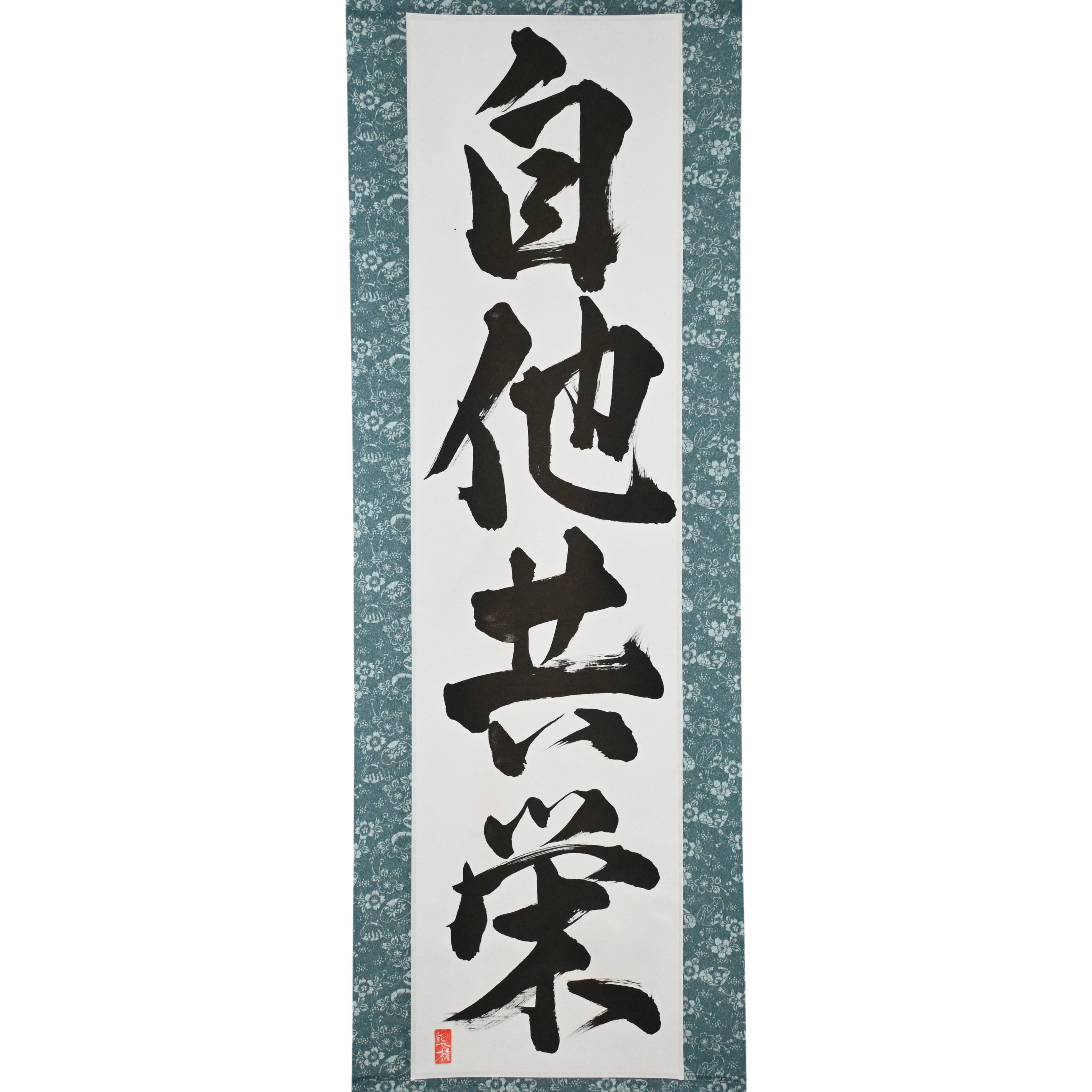 This Japanese calligraphy scroll features the timeless phrase 自他共栄 (Jita-Kyōei) — translated as "Mutual Welfare and Benefit". It is one of the two core principles of Judo, alongside 精力善用 (Seiryoku-Zenyō, "Maximum Efficient Use of Energy"), both established by Judo’s founder, Jigoro Kano (嘉納治五郎).