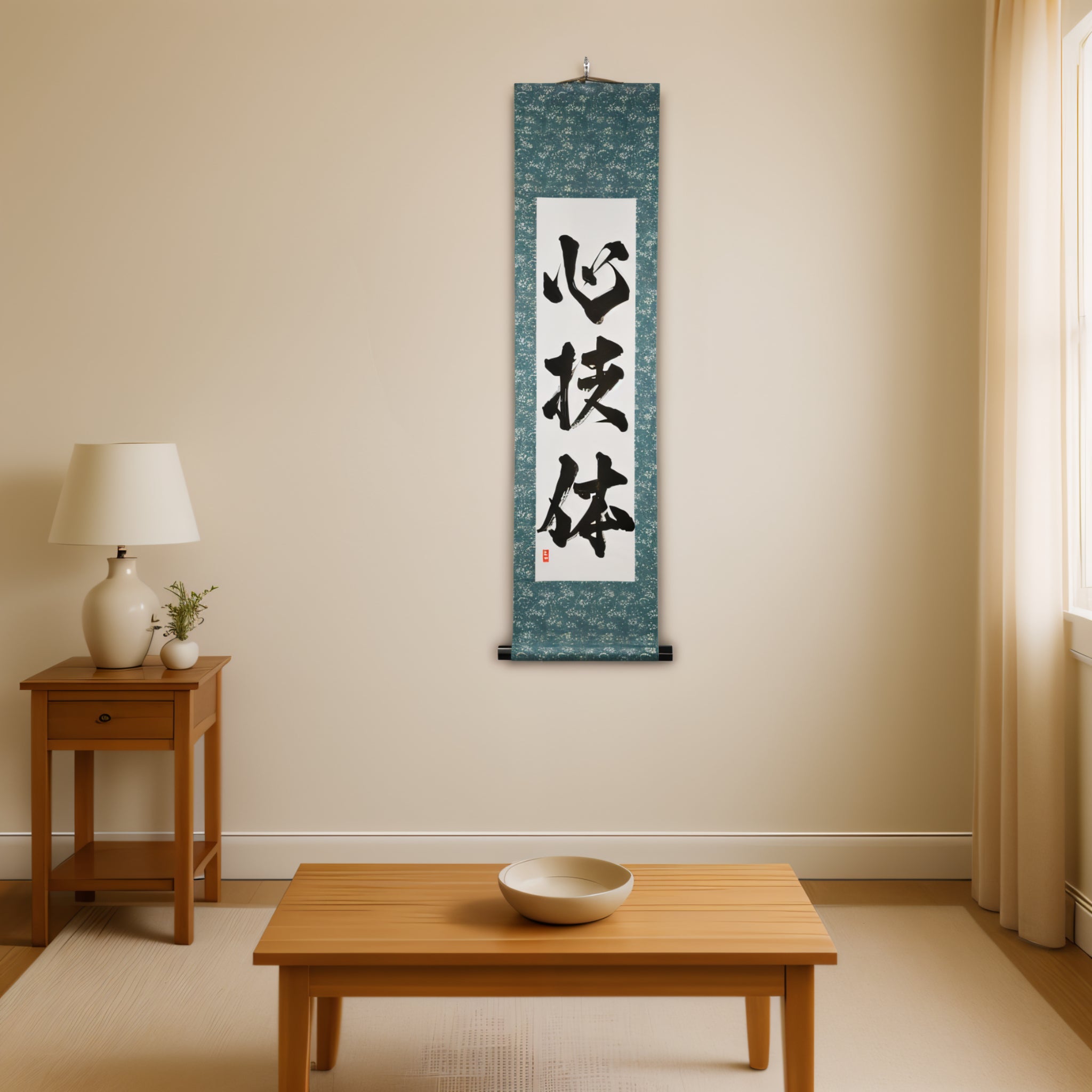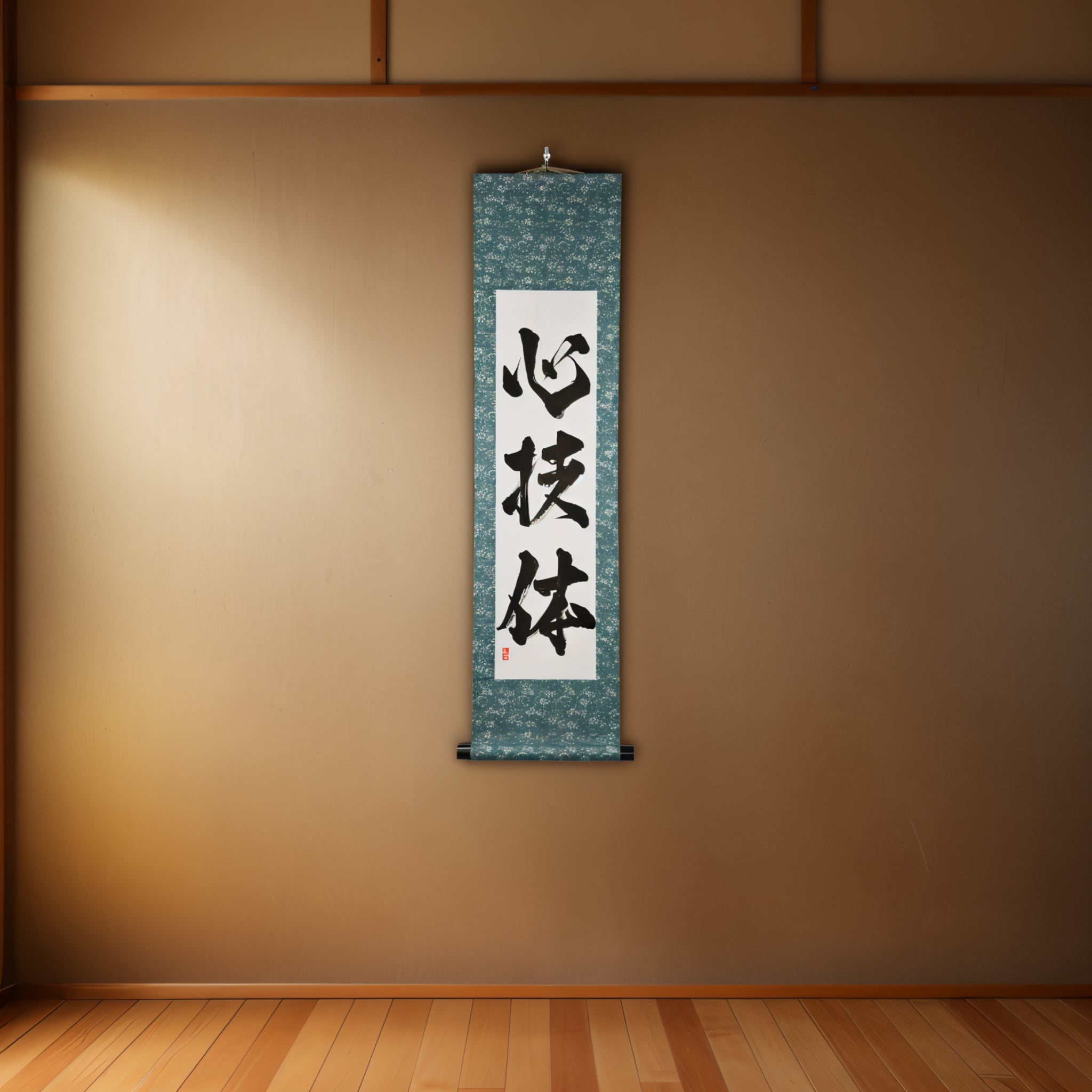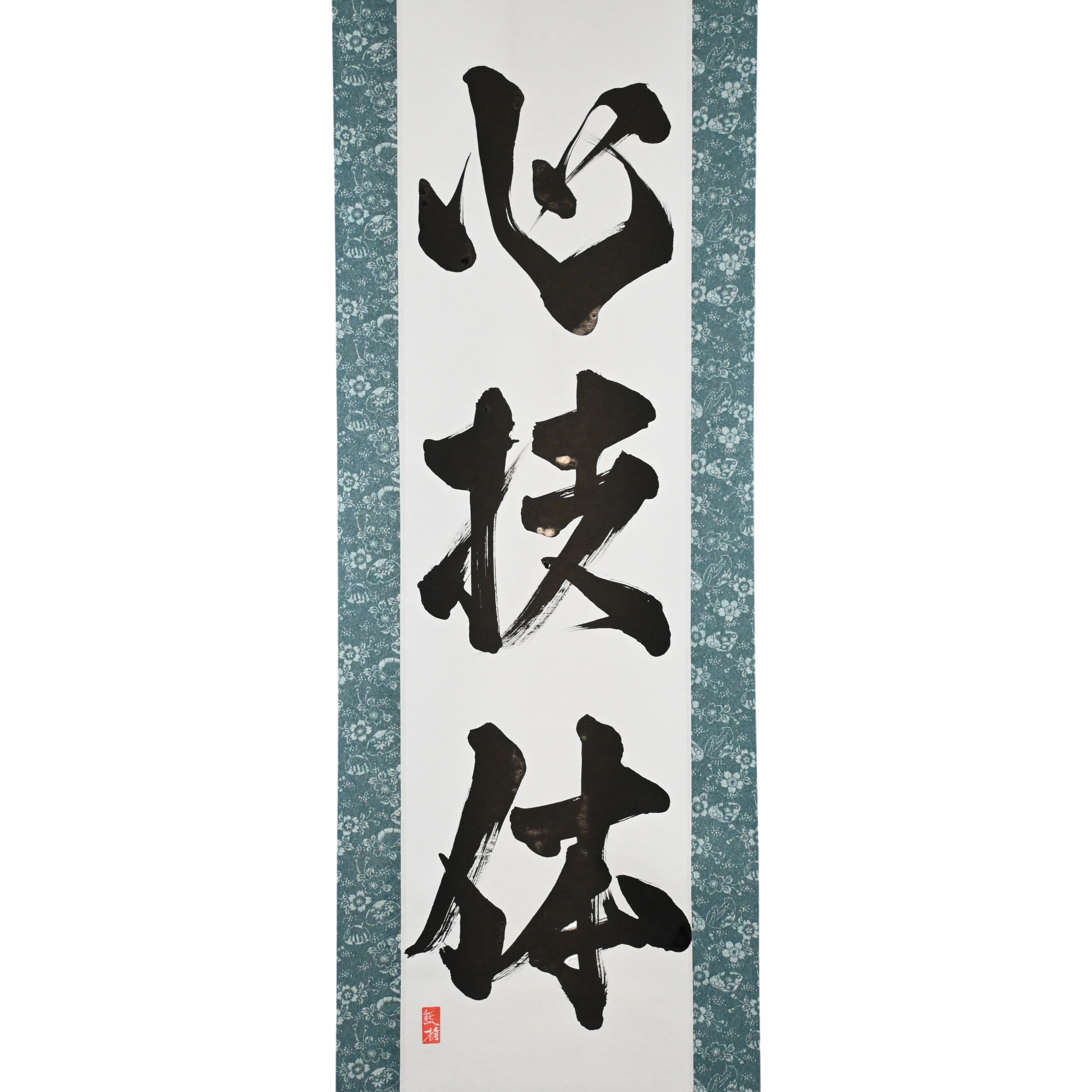 This Japanese calligraphy scroll features the revered phrase 心技体 (Shin-Gi-Tai) — the foundational concept behind all traditional Japanese martial arts, including Judo, Karate, Aikido, and more.