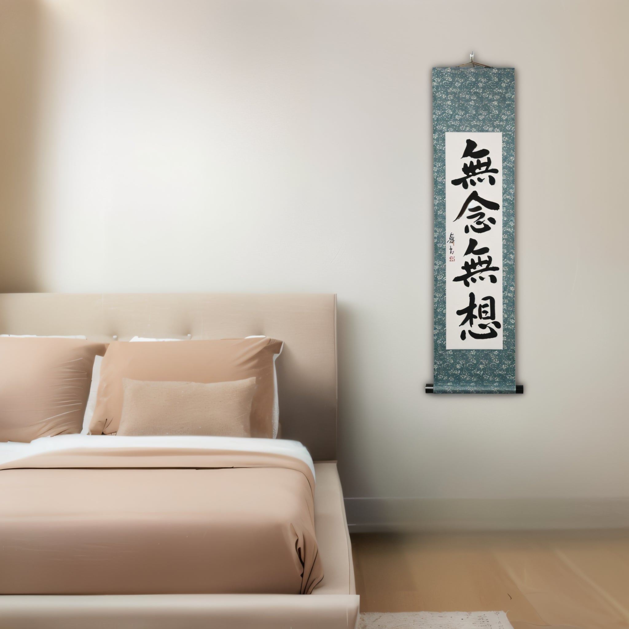 Ce rouleau de calligraphie japonaise présente le profond principe 禅 (Zen) 無念無想 (Munen Musō) — un état d'esprit libre de pensée et de distraction, fondamental dans la voie du Samouraï. Ancré à la fois dans la pratique 禅 (Zen) et le 武士道 (Bushidō), 無念無想 permet au guerrier d'agir avec une présence pure, répondant intuitivement et avec décision à chaque instant.