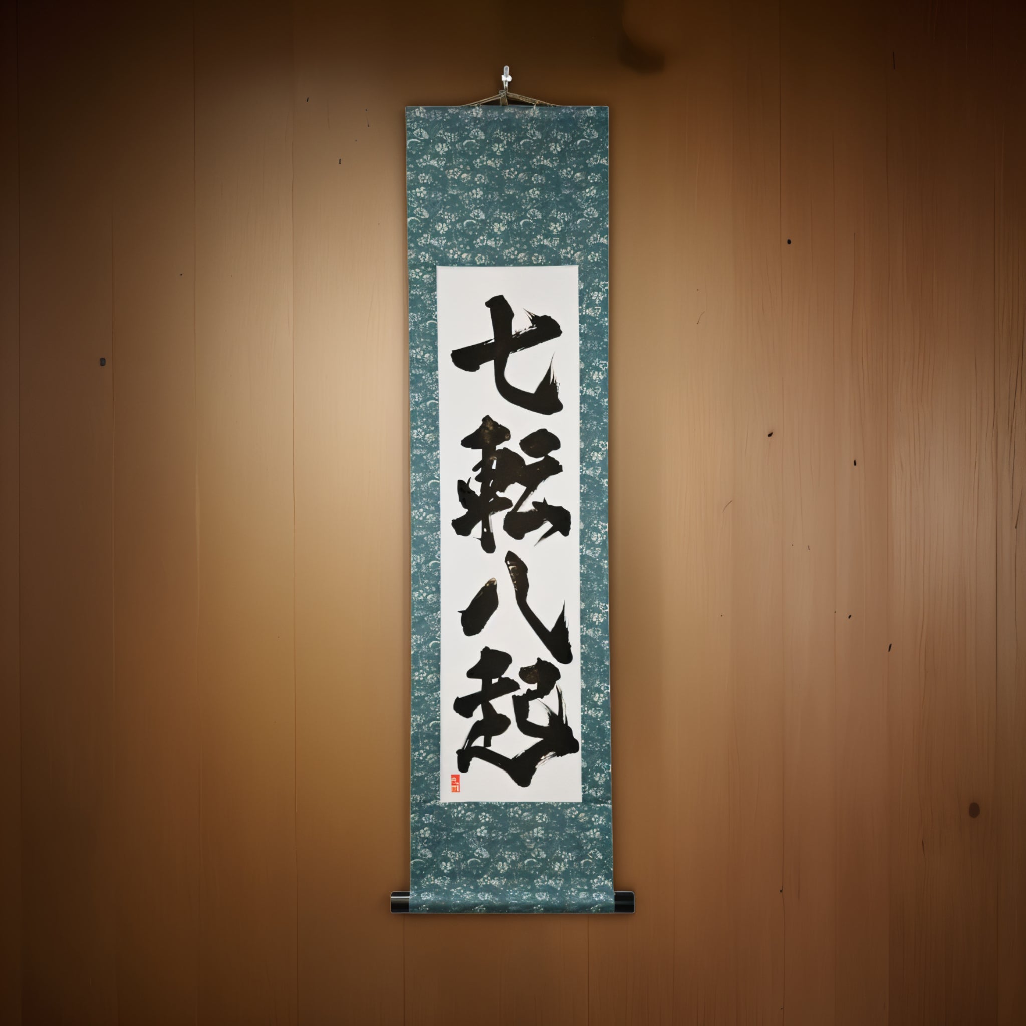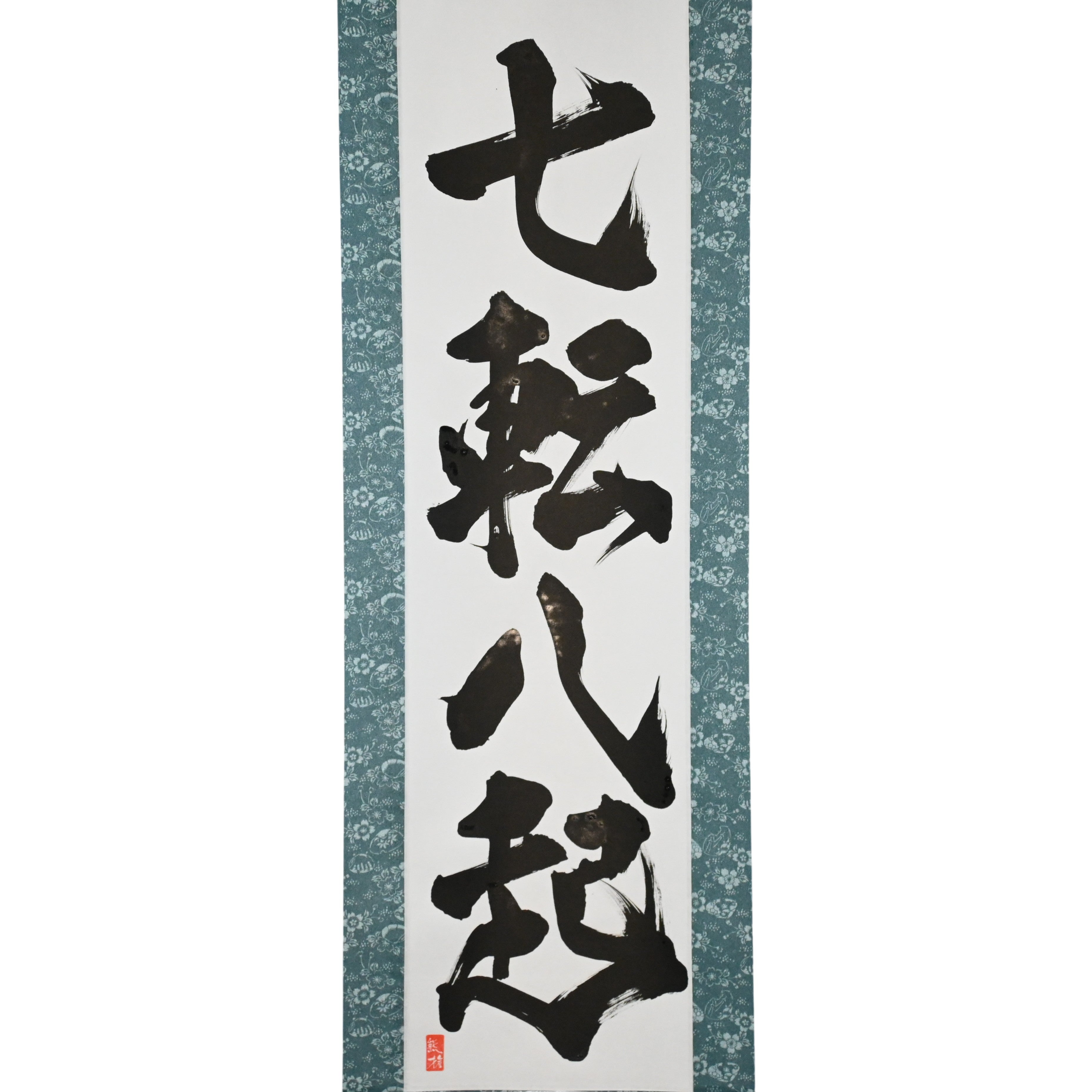 Ce rouleau de calligraphie japonaise présente la puissante phrase 七転八起 (Shichiten Hakki) — signifiant « Tomber sept fois, se relever huit fois ». Elle incarne l'esprit indomptable du samouraï : la résolution inébranlable de se relever, peu importe combien de fois la vie vous fait tomber.