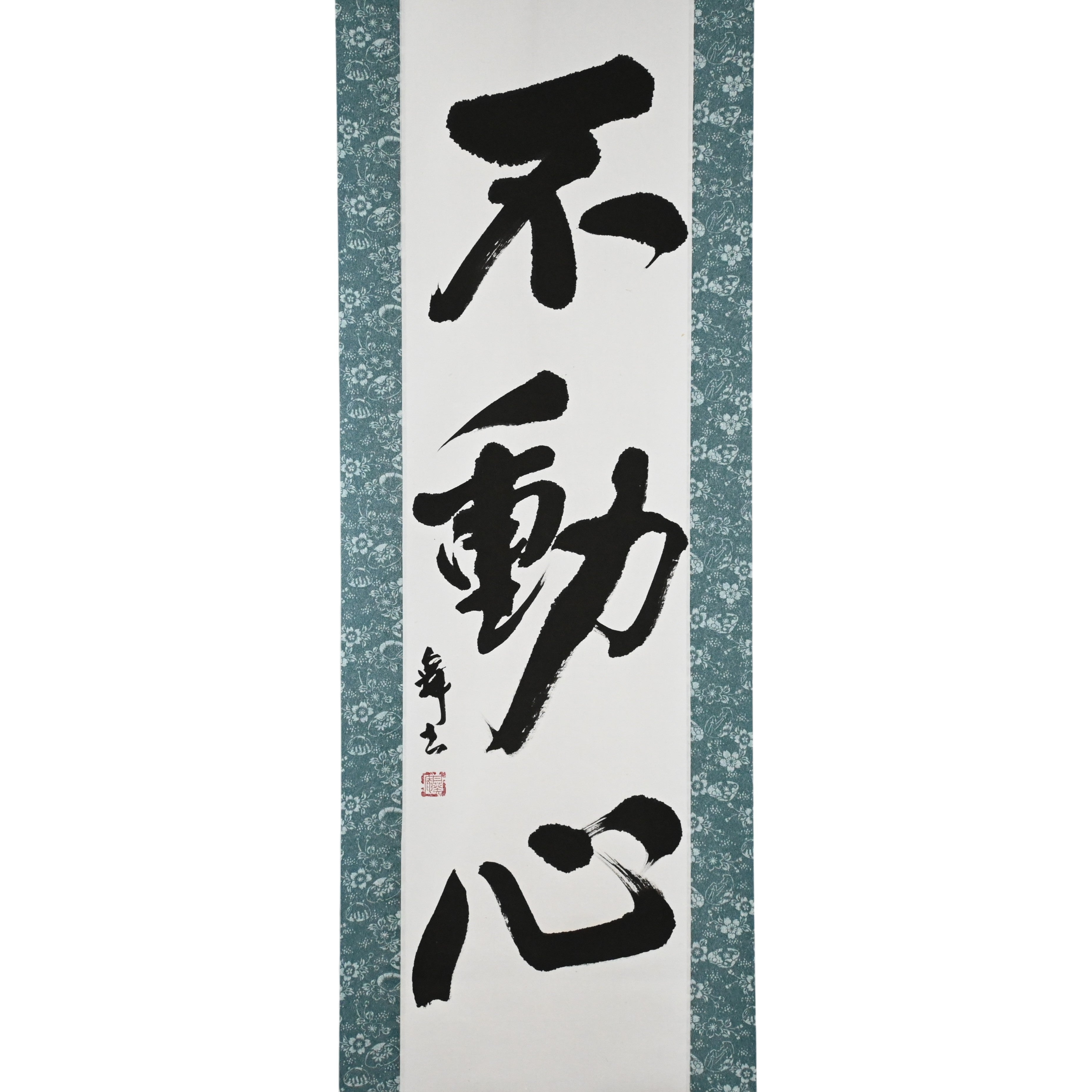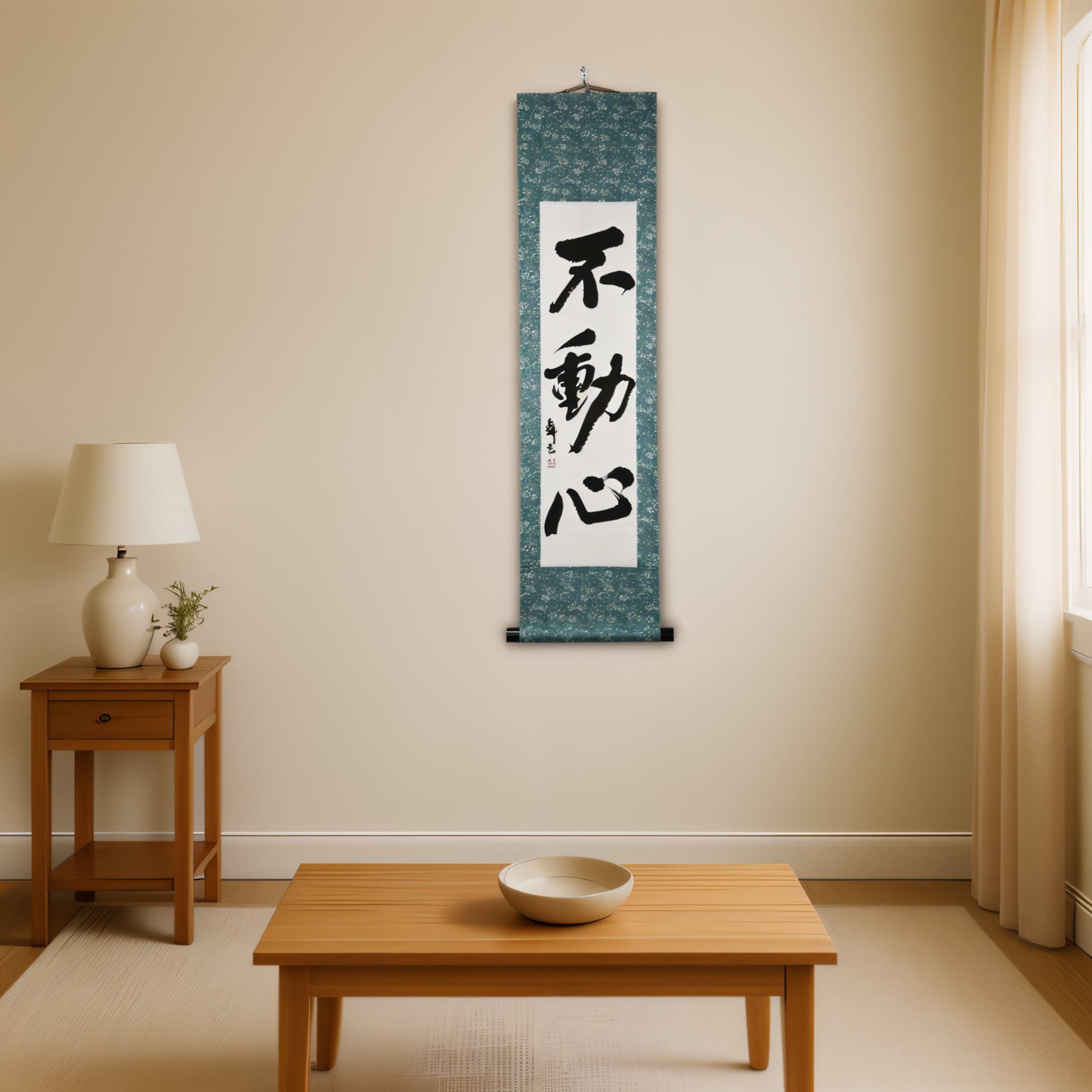 Ce rouleau de calligraphie présente le concept profond de 不動心 (Fudōshin) — « l'esprit immobile ». Il représente un état d'être calme et centré qui reste inébranlable face à la peur, la colère ou le doute. Dans les arts martiaux et la voie du Samouraï, le Fudōshin est considéré comme essentiel à la véritable maîtrise.
