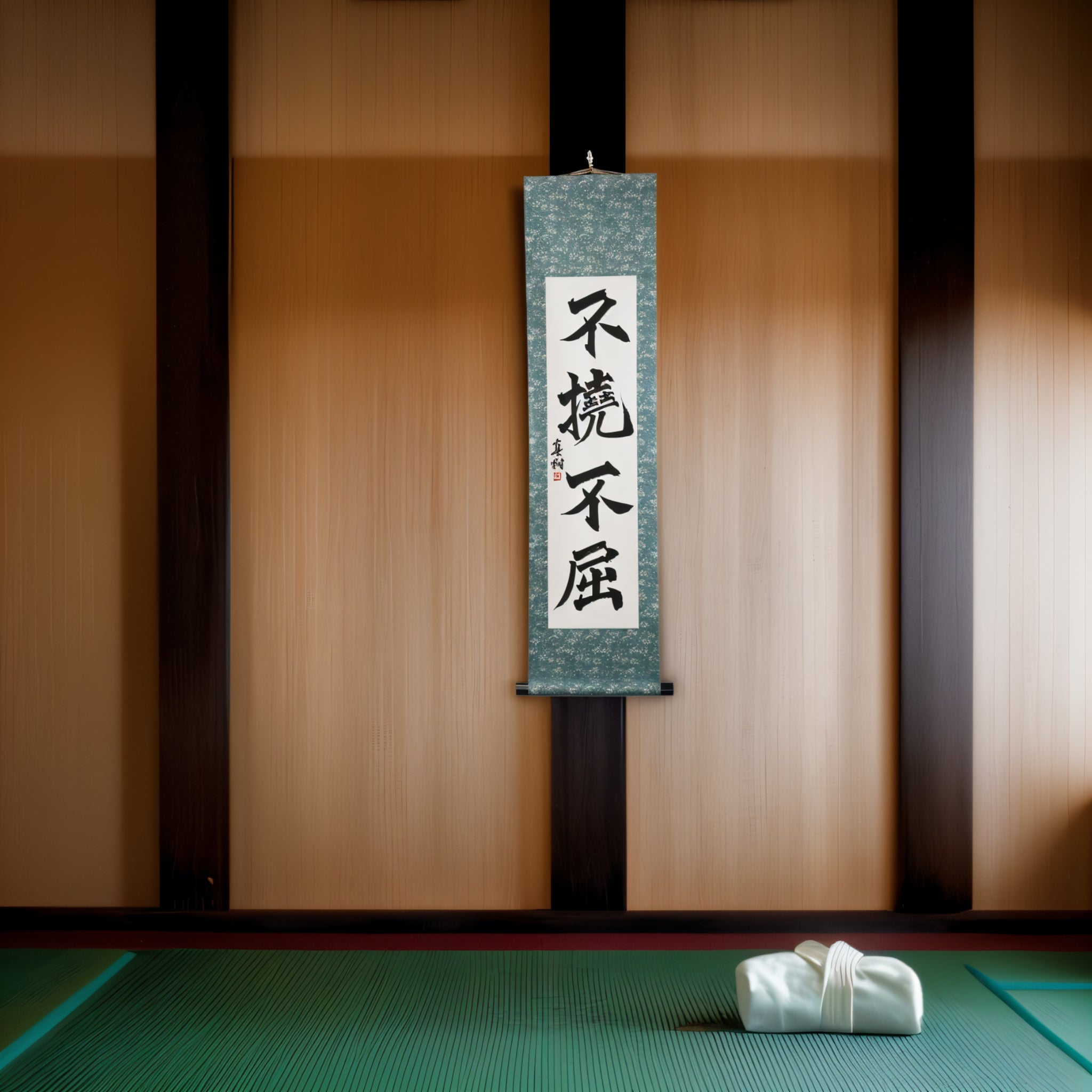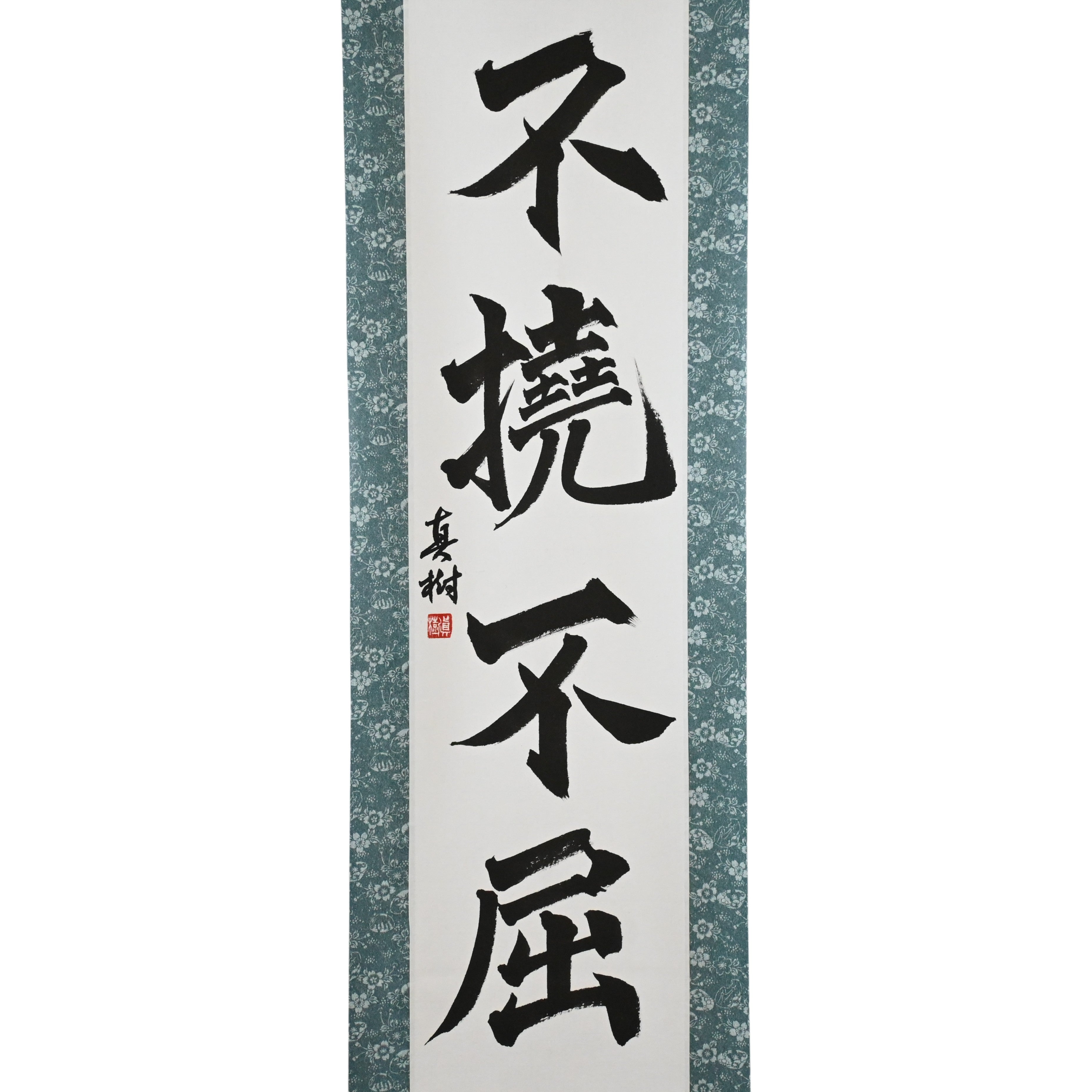 Ce rouleau de calligraphie japonaise présente la phrase audacieuse 不撓不屈 (Futō Fukutsu) — une expression puissante de l'esprit indomptable qui est au cœur des arts martiaux japonais et du code des Samouraïs.