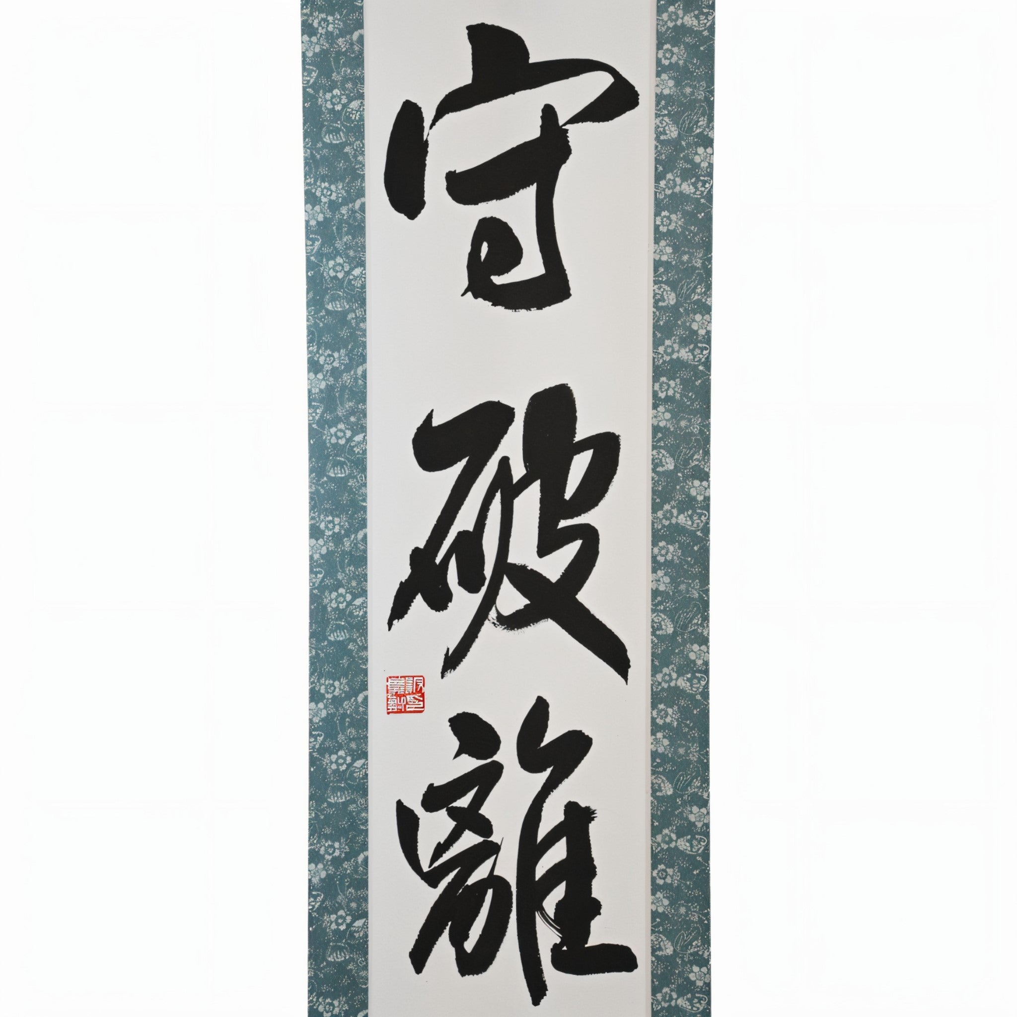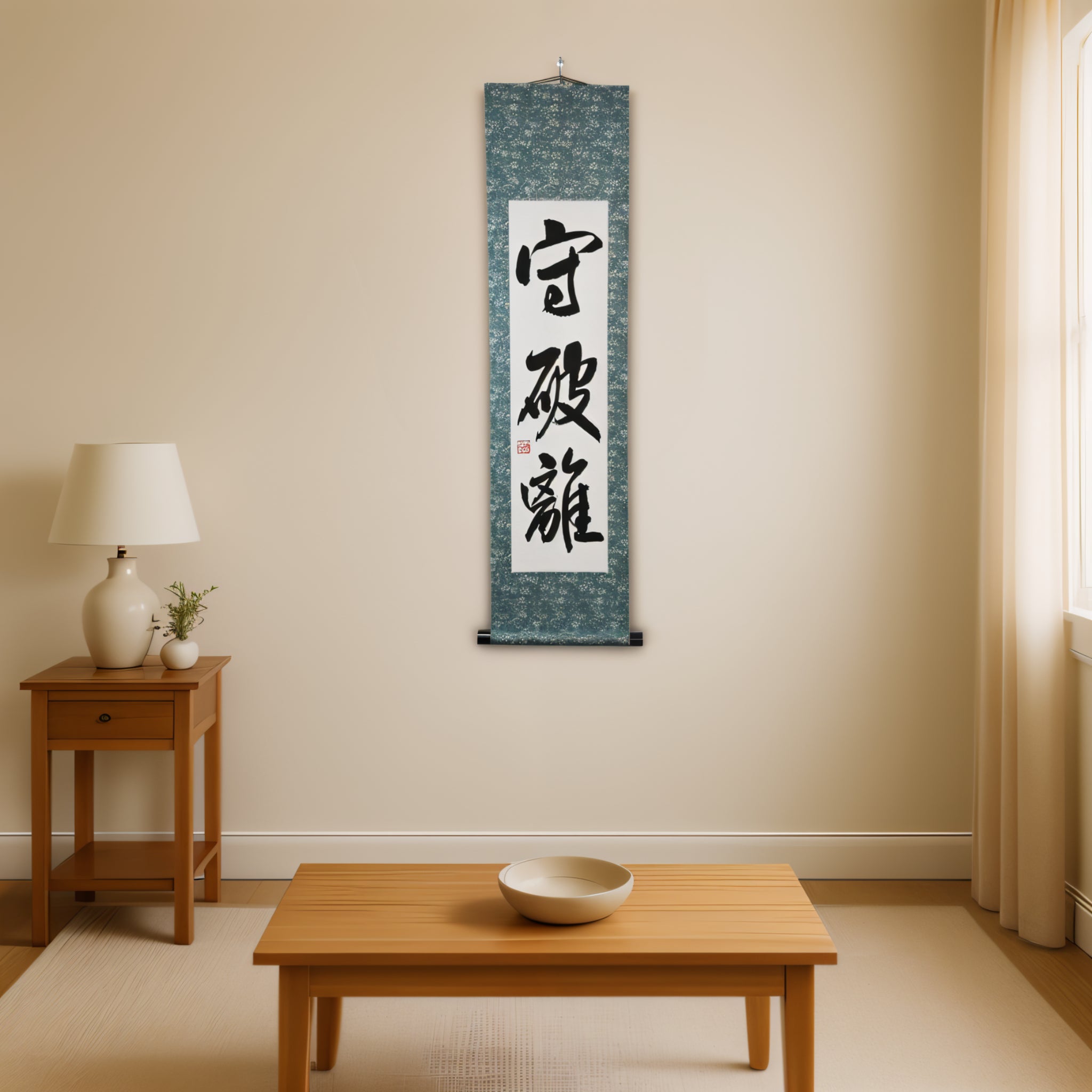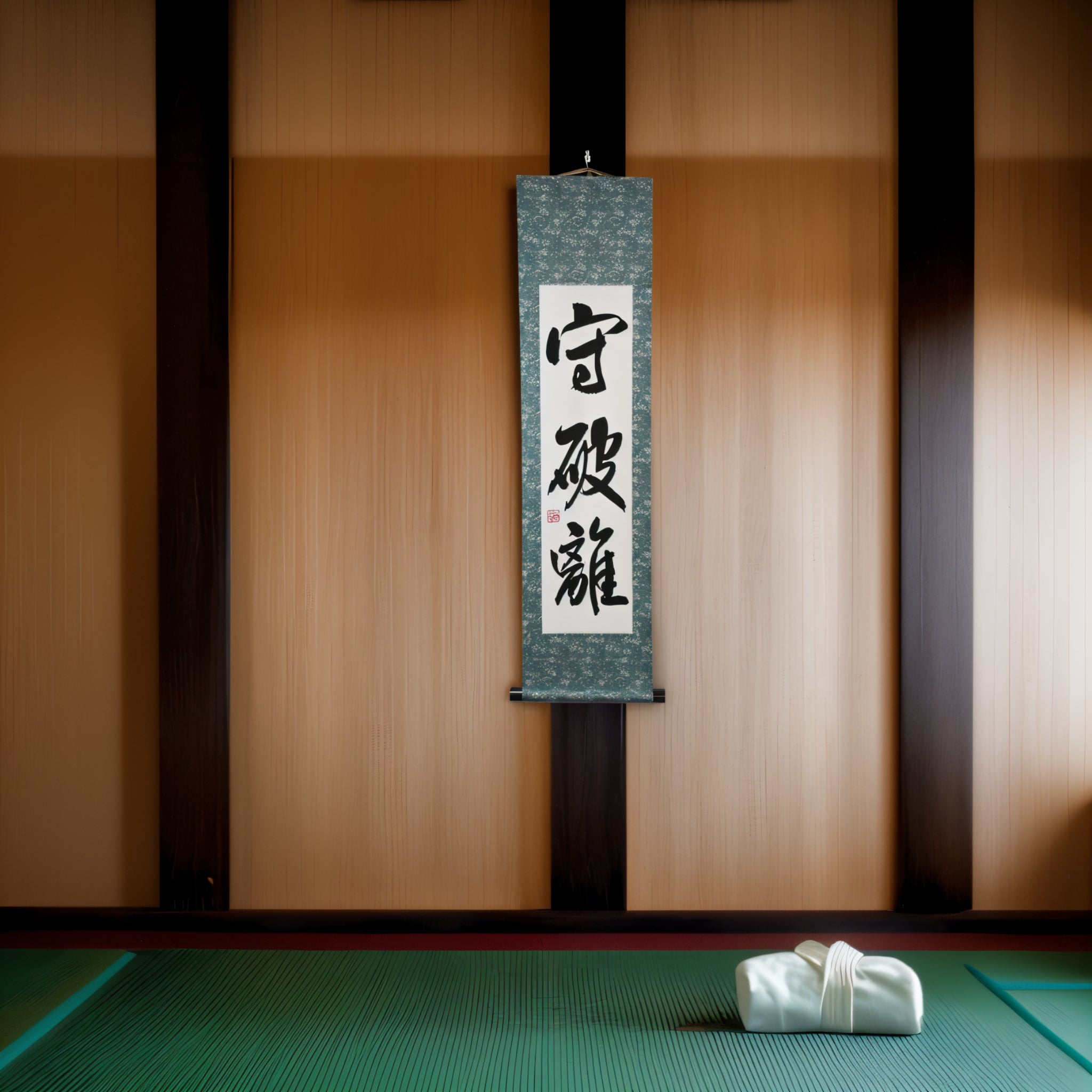 Diese japanische Kalligraphie-Rolle zeigt den zeitlosen Ausdruck 守破離 (Shuhari) — eine tiefgründige Lehre, die den Weg des Wachstums und der Meisterschaft in allen Kampfkünsten einfängt.