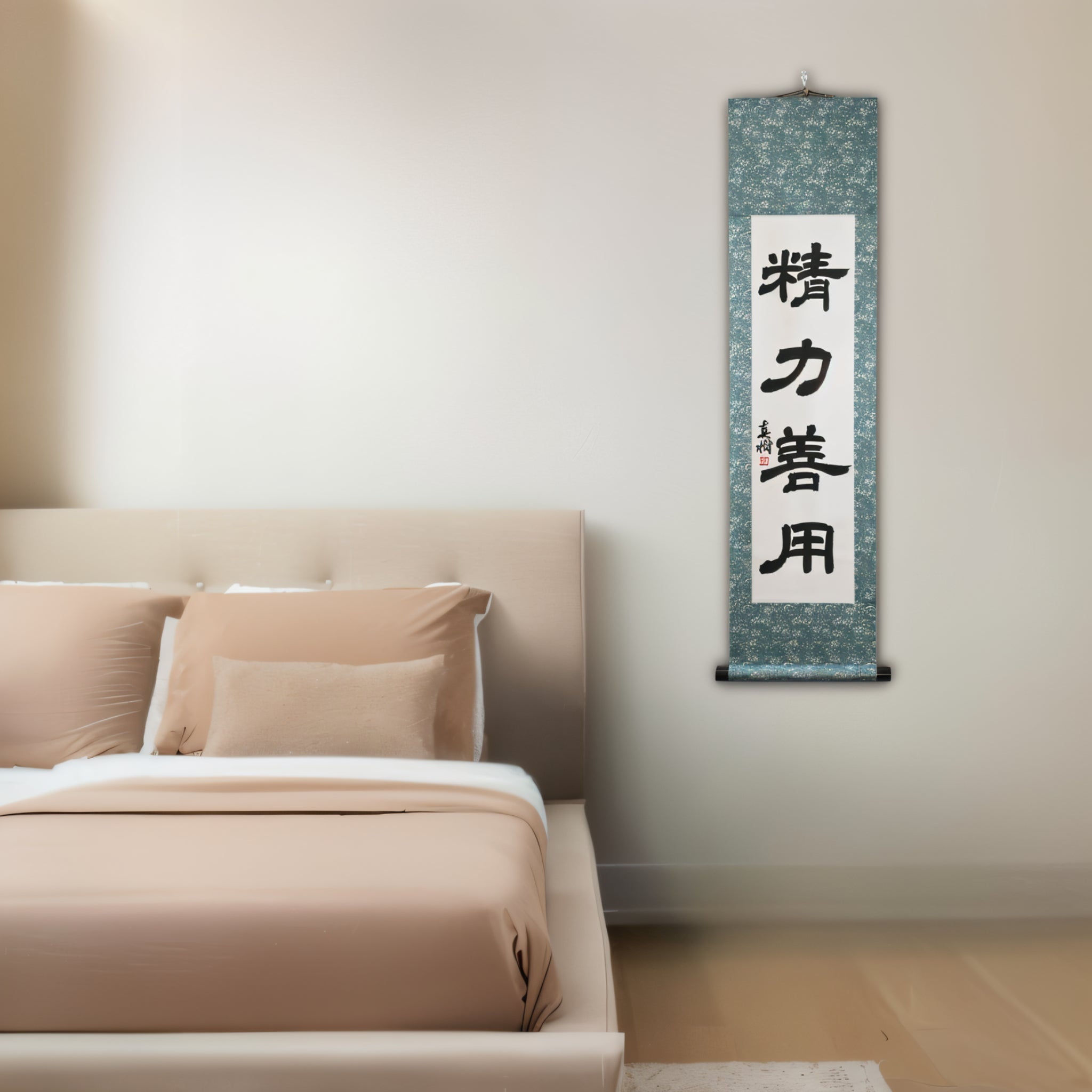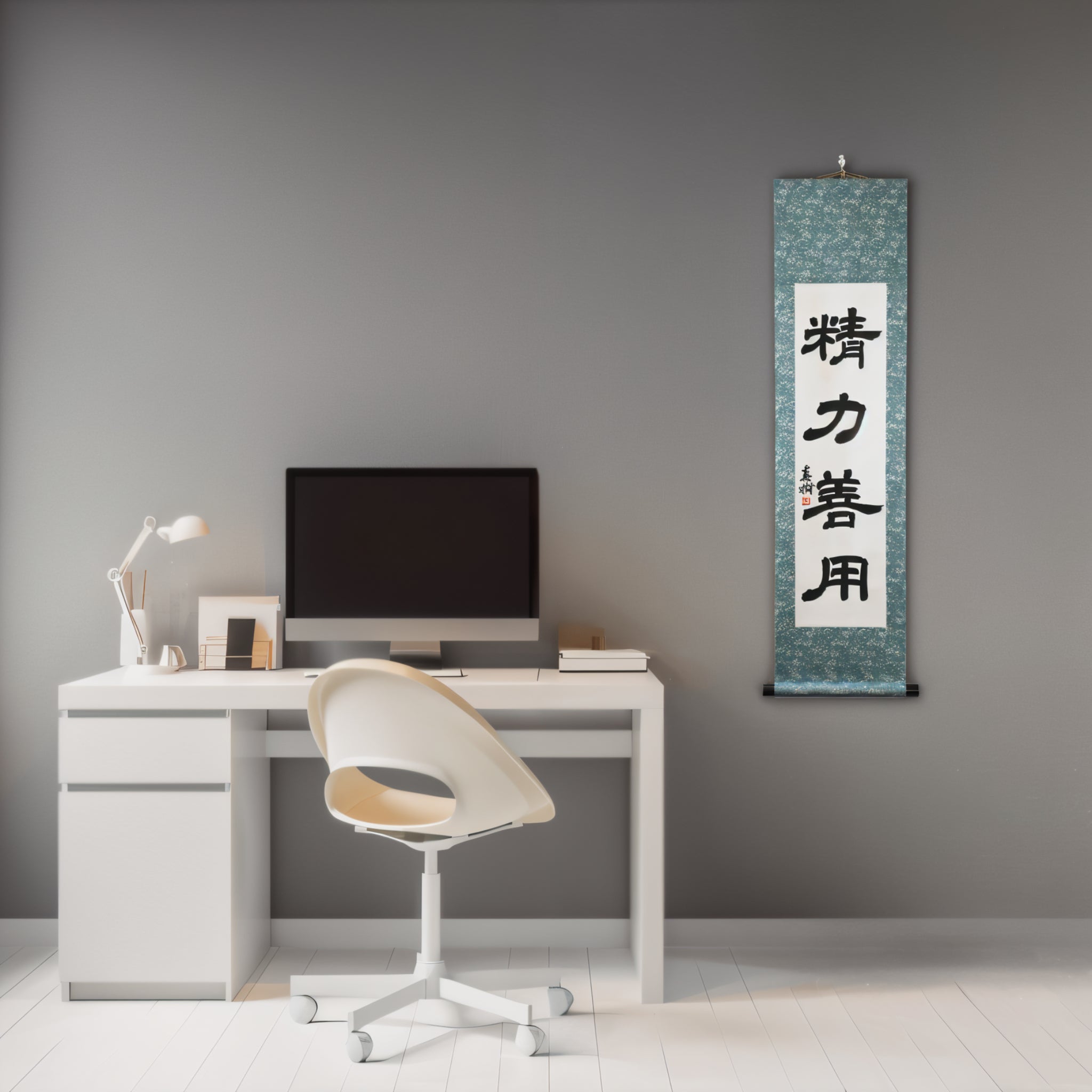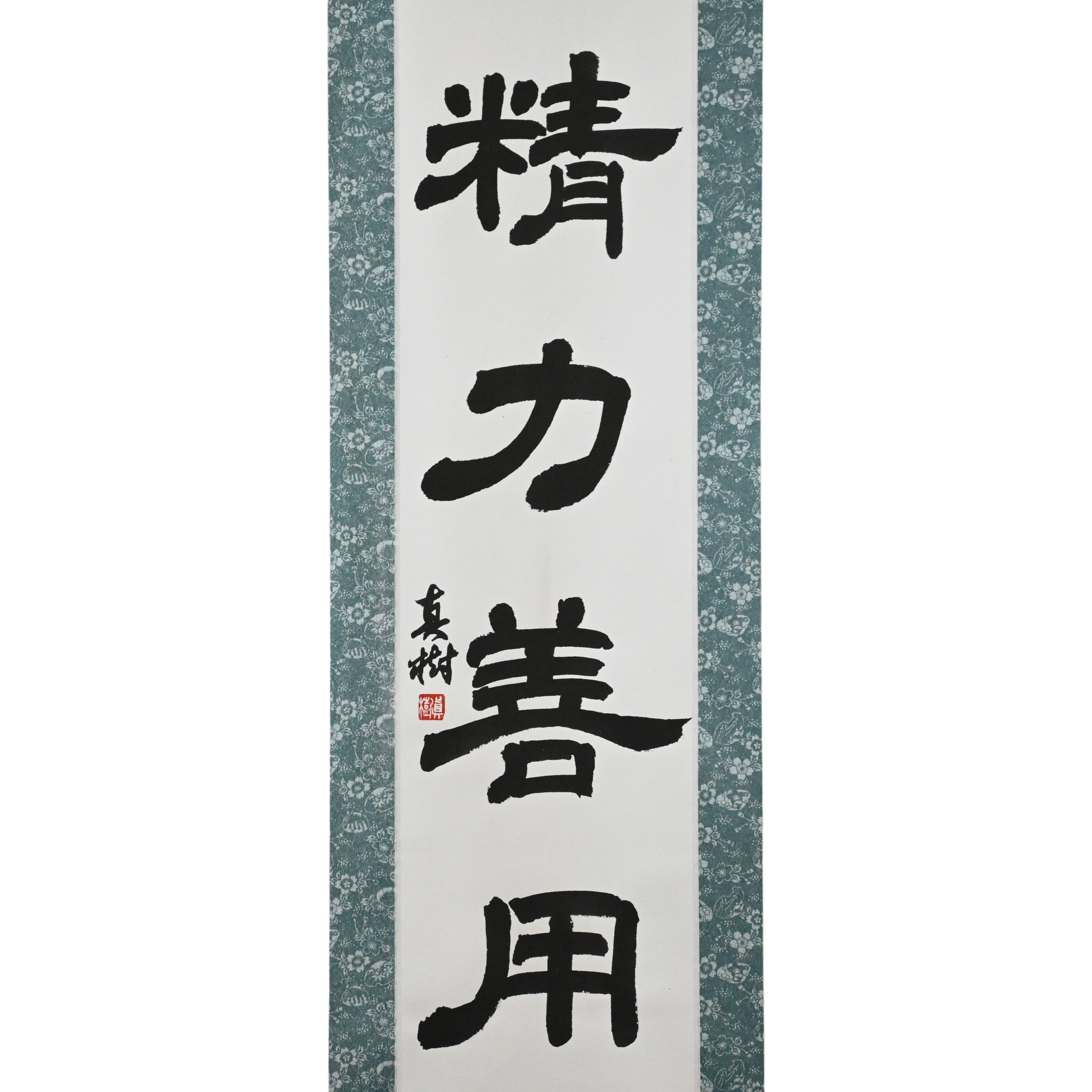 Diese japanische Kalligraphie-Rolle zeigt den zeitlosen Ausdruck 精力善用 (Seiryoku-Zenyō) — übersetzt als "Maximale effiziente Nutzung von Energie". Es ist eines der beiden Kernprinzipien des Judo, neben 自他共栄 (Jita-Kyōei, "Gegenseitiges Wohlergehen und Nutzen"), beide von Judos Gründer Jigoro Kano (嘉納治五郎) festgelegt.