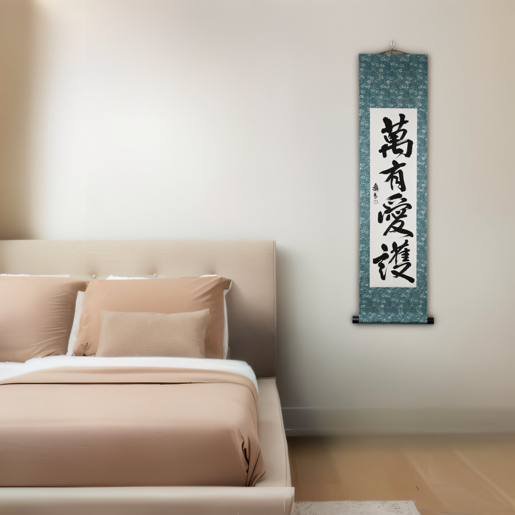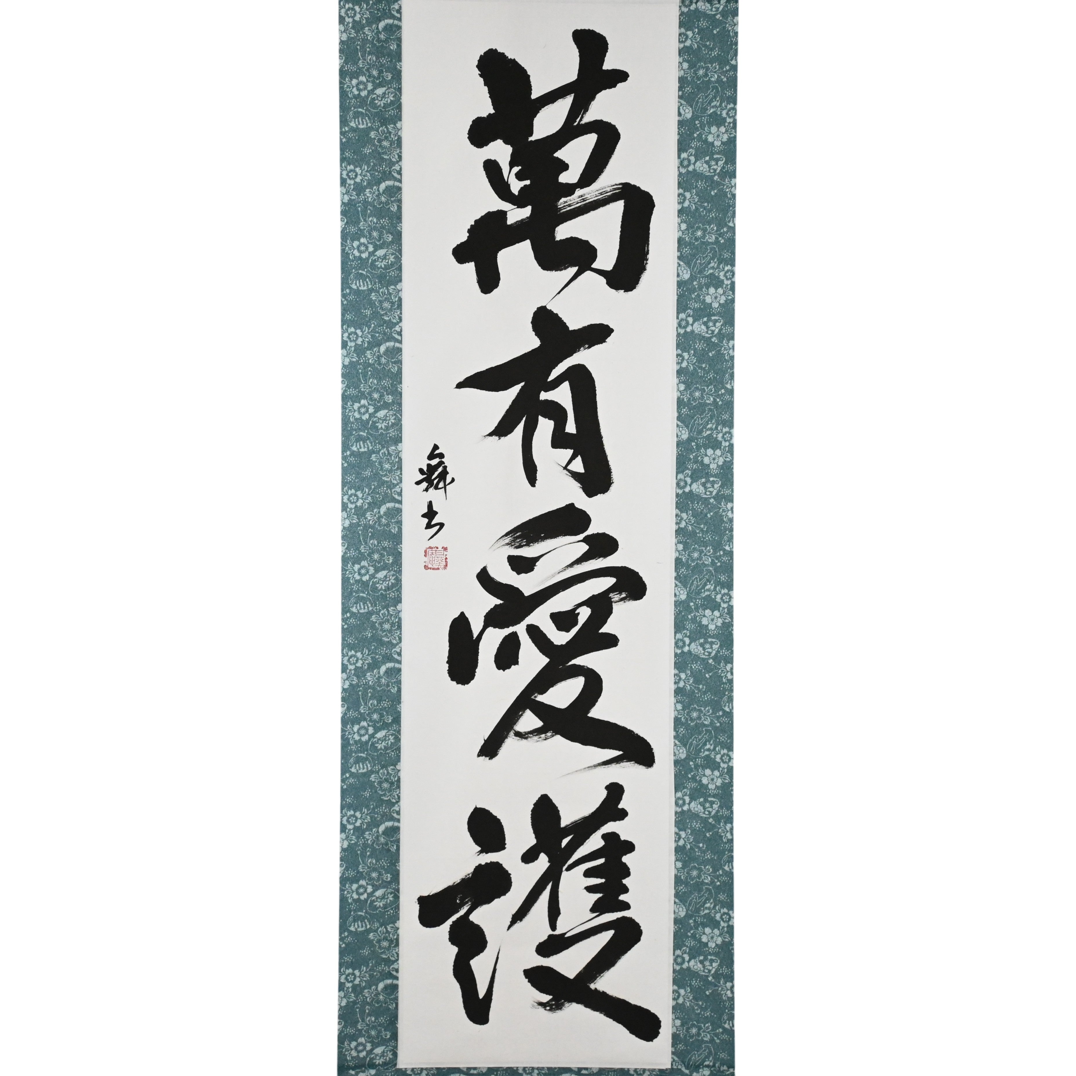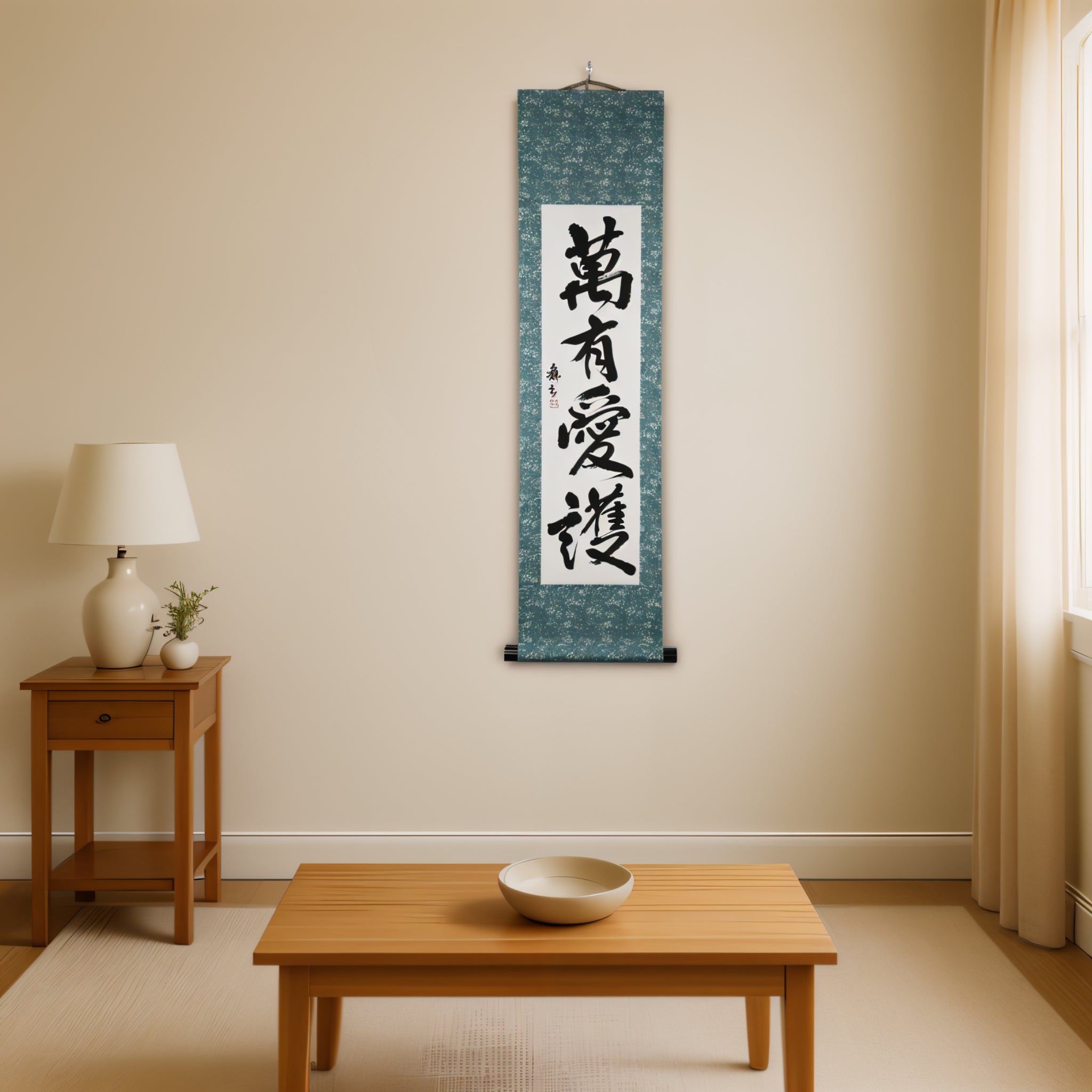 Diese japanische Kalligraphie-Rolle zeigt den kraftvollen Ausdruck 萬有愛護 (Banyū Aigo), was „Universelle Liebe und Schutz“ bedeutet.
