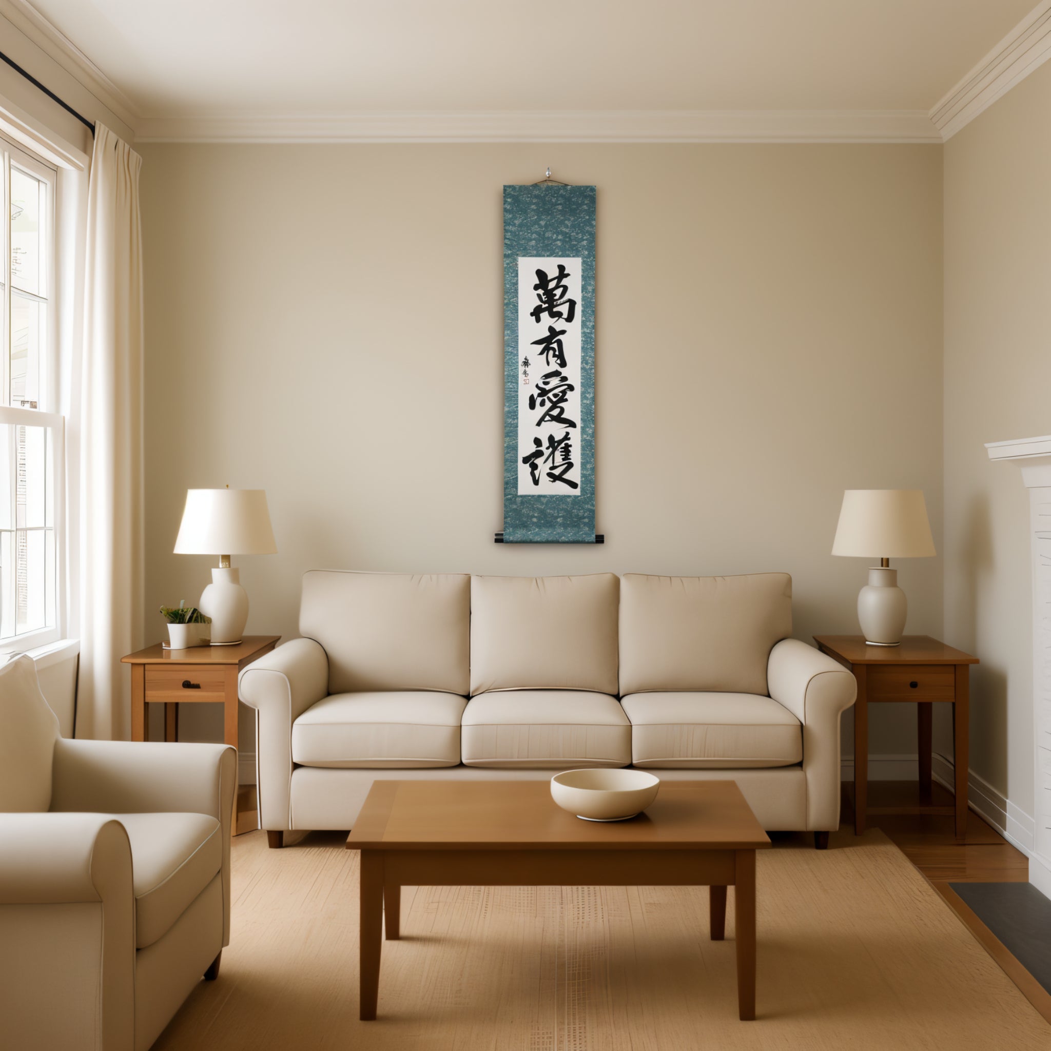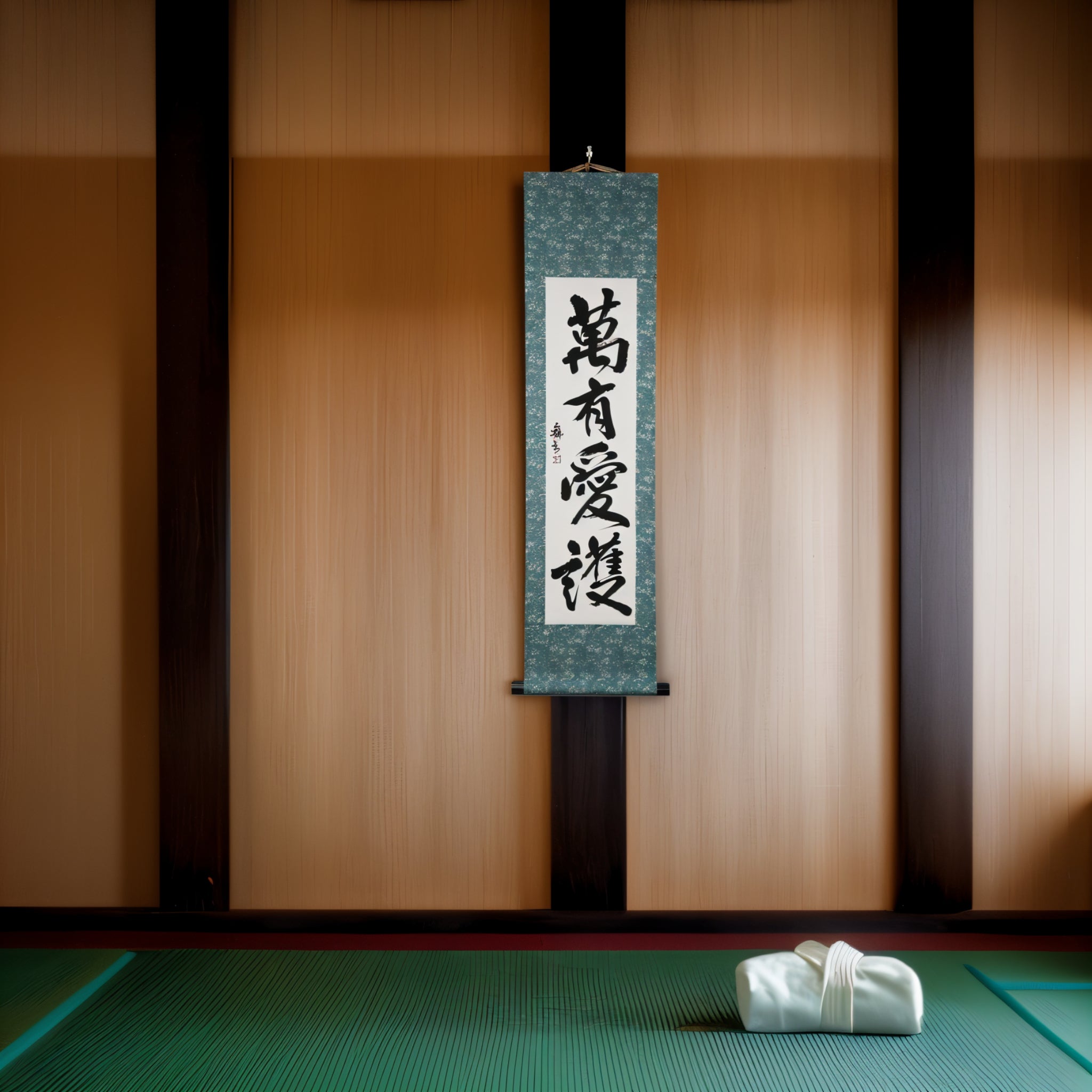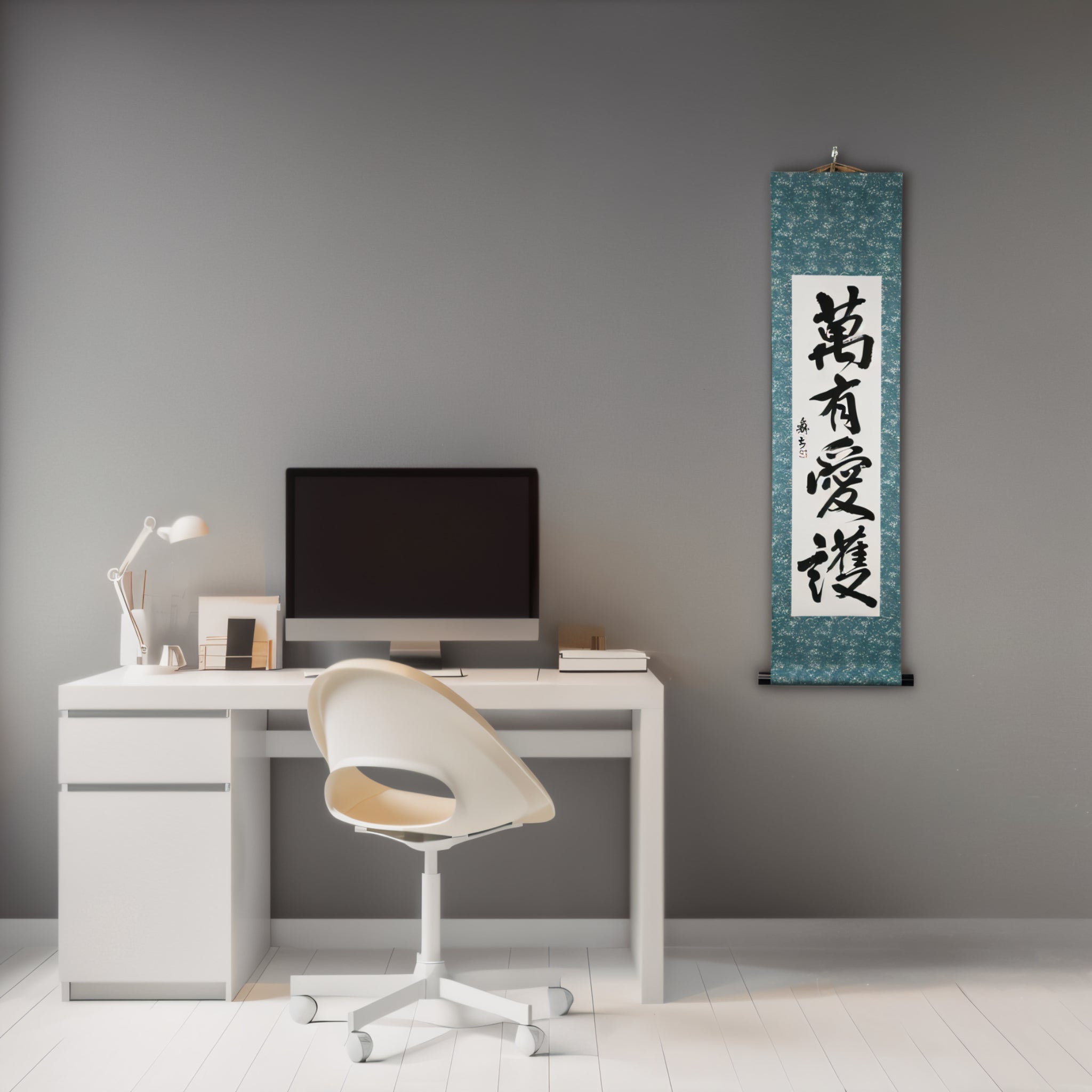 Diese japanische Kalligraphie-Rolle zeigt den kraftvollen Ausdruck 萬有愛護 (Banyū Aigo), was „Universelle Liebe und Schutz“ bedeutet.